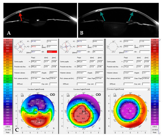 The exchange of a previously implanted single ICRS with a long-arc 320° ICRS. (A). Single ICRS (red arrow) preoperatively. (B). After exchange of single ICRS for a long-arc 320° ICRSs (green arrows) postoperatively. (C). A comparative preoperative axial map, showing significant flattening of up to 13 D postoperatively (C, right).