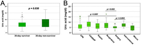 Levels of uric acid in 30-day survivors versus non-survivors are displayed in (A) (n = 168/58 tested by the Mann–Whitney U test). Stratification for the primary cause of admission (n = 51/52/22/23/47/25/6) highlights differences between cardiac (CS/ADHF), respiratory, interventional, and surgical subgroups in (B) (Tested by Kruskal–Wallis test with Dunn’s post hoc testing—Bonferroni corrected). A total of 226 patients were analysed, and p-values of <0.05 are considered statistically significant. CPR: cardiopulmonary resuscitation; CS: cardiogenic shock; ADHF: acute decompensated heart failure.