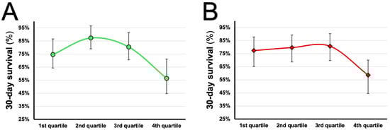 A significant correlation was found between uric acid and mtDNA (r = 0.214, p = 0.020, Supplemental Figure S1). However, given the weak correlation, any interpretation should be made cautiously [16]. Furthermore, a visual representation of the 30-day survival is depicted for quartiles of uric acid and mtDNA. Both parameters exhibit a nonlinear relationship with the average 30-day survival. When stratified by uric acid quartiles, survival peaked at the 2nd and 3rd, followed by a marked decline at the 4th quartile (Figure 2A). Chi-square analysis confirmed a significant association between uric acid quartiles and survival (Pearson’s Chi-square p = 0.002). The survival pattern was visually compatible with an inverted U-shaped relationship (U-shaped in terms of mortality). However, formal quadratic trend testing did not reach statistical significance (p = 0.093). In contrast, mtDNA showed a significant association with survival across quartiles (Pearson’s Chi-square p = 0.032) and a significant quadratic trend (p = 0.044), driven by a decline in survival at the highest quartile (Figure 2B). This pattern indicates a threshold effect rather than a classical U- or J-shaped relationship, with survival remaining stable across lower quartiles but decreasing notably at the highest mtDNA levels.