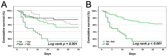 Additionally, Kaplan–Meier analyses were used to assess the prognostic value of uric acid. First, stratification into quartiles revealed the highest cumulative mortalities in the 1st and 4th quartiles. Furthermore, the first to third quartiles were combined and compared to the fourth quartile. Both depicted Kaplan–Meier analyses displayed significant differences in cumulative survival for uric acid (Figure 3A,B, log-rank p = 0.001 and p < 0.001).