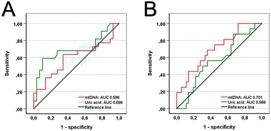 Finally, subgroup analyses for the primary cause of admission found differences in the prediction of 30-day mortality comparing uric acid and mtDNA. The 30-day non-survivors admitted following cardiac arrest had significantly higher levels of uric acid but not mtDNA compared to survivors (Supplementary Table S1). On the other hand, patients admitted due to cardiogenic shock or acute decompensated heart failure displayed significantly elevated levels of mtDNA but no differences in uric acid (Supplementary Table S1). Moreover, differences in positive prediction rates are present when comparing uric acid and mtDNA. ROC curves predicting 30-day mortality revealed an AUC of 0.696 for uric acid and 0.596 for mtDNA in patients admitted following cardiac arrest (Figure 4A). In contrast, patients admitted with cardiogenic shock or acute decompensated heart failure showed a different pattern, with an AUC of 0.701 for mtDNA and 0.568 for uric acid (Figure 4B). While these values reflect only moderate discrimination, they may still offer insight into context-specific prognostic performance. Predictive properties of uric acid and mtDNA for the remaining causes of admission can be found in Supplementary Table S1.