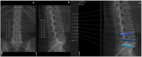 Figure 1. Preoperative (A) anterior–posterior (AP) and (B) sagittal reconstruction of bone anatomy according to preoperative CT with automatic identification of vertebras. (C) Screw recommendations in selected vertebrae for stabilization of L4-S1.
