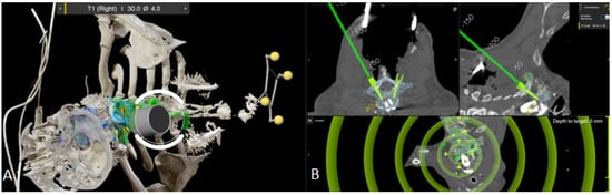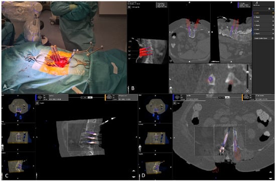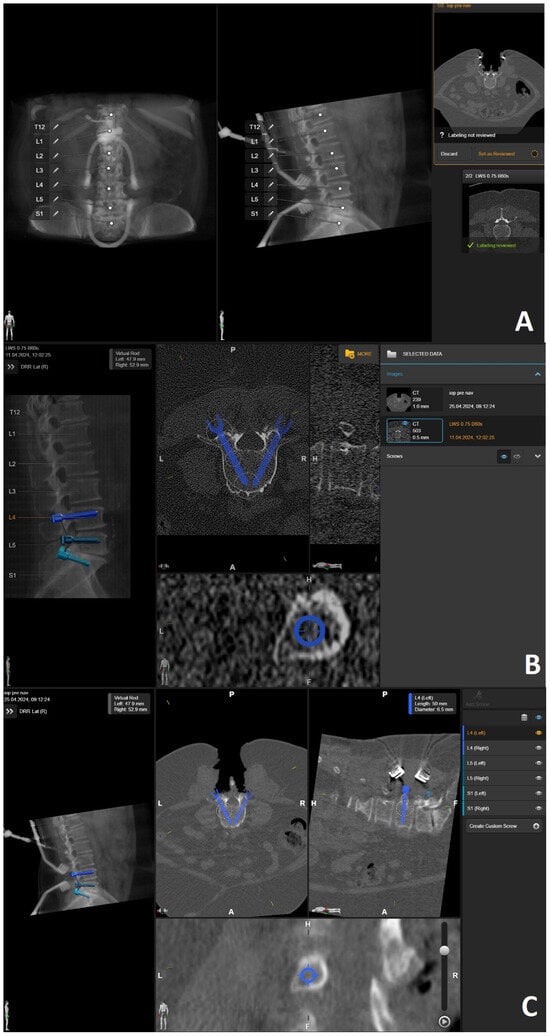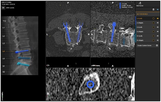- Preoperative imaging and screw planning. In addition to magnetic resonance imaging (MRI) of the spinal region to be examined and instrumented, all patients received preoperative three-dimensional (3D) CT imaging of the part of the spine that was to be stabilized. The MRI and CT data were exported to the BrainLab navigation software (https://www.brainlab.com/surgery-products/overview-spinal-trauma-products/spinal-navigation/, accessed date 20 June 2025) and fused either rigidly or elastically. The navigation software includes a screw planning application that was used to plan the radius, length, and trajectory of the PS prior to surgery. The software enables automatic identification of the vertebra, followed by automatic screw planning for PSs in the selected vertebra. The proposed preplanned screws were then manually corrected according to the surgeon’s preference. For this step, it was crucial to have an artifact-free, high-resolution 3D CT of the spine, i.e., the area intended for instrumentation. (Figure 1 and Figure 2) [].