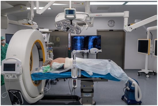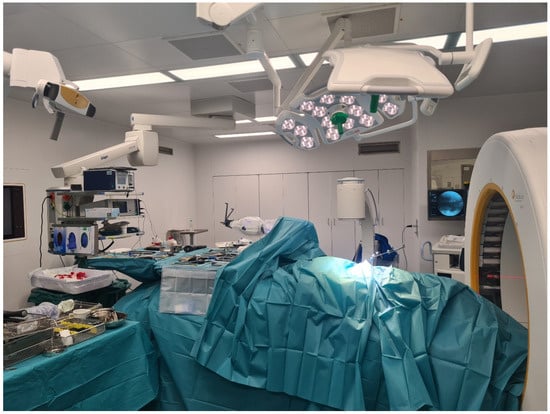 - After exposing the bone anatomy and fixing the reference array, a registration scan with automatic registration of the patient was performed. The surgical area is covered with a sterile drape so that the reference array is visible to the navigation camera, and the scan length is marked with a sterile pen. The registration scan is performed during apnea so that any respiratory artifacts that may occur do not affect accuracy. The scan takes 7–12 s. All personnel leave the operative room for the scan, so that the radiation exposure for staff is zero. Low-dose protocols were used for the scans. The effective dose is calculated by multiplying the total dose length product (DLP) by ED/DLP conversion factors (17.8 μSv/Gy × cm for thoracic and 19.8 μSv/Gy × cm for lumbar spine scans). After the scan, the image data was automatically transferred to the navigation system (BrainLab, Munich, Germany) without user interaction for automatic patient registration. The entire process of covering the patient with a sterile drape for the scan, as well as the scan itself, takes 10–15 min. The registration accuracy was checked and recorded using a pointer and skin fiducials and by placing the pointer in the fixation area of the registration array. In open cases, additional verification of the bony structures was performed. (Figure 5 and Figure 6).