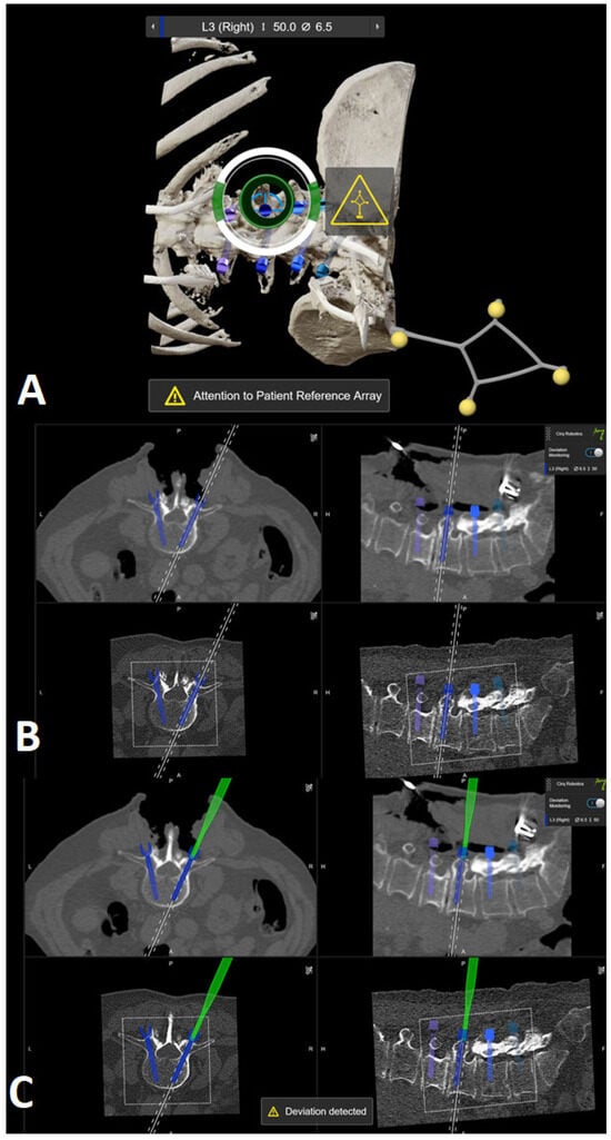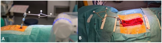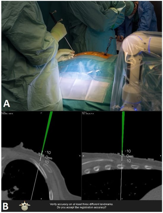 The implantation of pedicle screws (PSs) is of central importance for the treatment of spinal instability and the achievement of spinal fusion in degenerative, oncological, infectious, and traumatic diseases of the spine []. Standard techniques for PS implantation include freehand implantation, which is always performed as a part of open spine surgery and is based exclusively on knowledge of anatomical landmarks. Historically, this was followed by fluoroscopy-guided (FG) techniques, using intraoperative X-rays (C-arm). The development of cranial navigation in the 1990s subsequently led to the development of navigated PS placement, either using surface-based registration or automatic registration based on intraoperative imaging. The first system for robotic-guided (RG) PS implantation approved by United States (US) Food and Drug Administration (FDA) was SpineAssist by Mazor Robotics in 2004 [,]. Over the past two decades, numerous robotic systems for RG PS placement have been introduced to the market. Currently, robotic assistance is primarily used for PS placement [].The main advantage of RG PS placement is its higher accuracy compared to other techniques, even compared to navigation, as well as the ability to place PSs with larger diameters and longer lengths compared to navigation alone [].