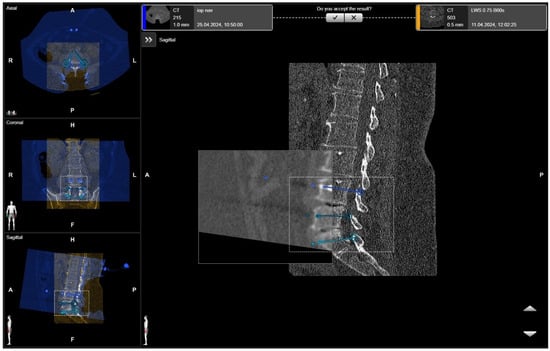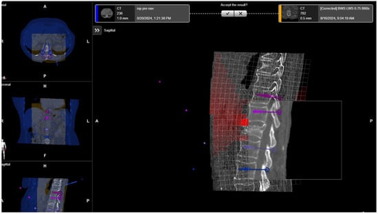 - After selecting a region of interest (ROI), the iCT scan was merged with a preoperative scan. A rigid fusion was performed, and in cases of instability of the spine due to a tumor or fracture, as well as in cases of longer constructs, elastic fusion was performed (Figure 7 and Figure 8). In selected cases with longer thoracolumbosacral constructs, two scans were performed, with repositioning of the reference array to avoid compromising accuracy for levels far from the reference array. After fusion of the scans, the planned screw trajectories were checked and corrected as necessary (Figure 9) [].