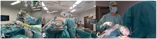 - Desai, S.K.; Adams, J.P. Initial single surgeon evaluation comparing C-arm fluoroscopy with the Cirq robotic assistance device for instrumentation of the thoracolumbar spine. BMC Surg. 2022, 22, 434. [Google Scholar] [CrossRef]