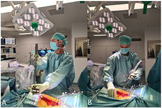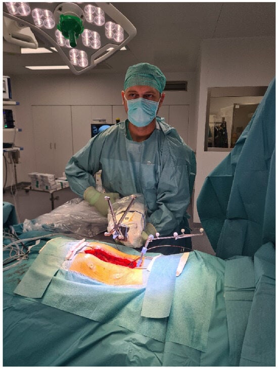 - The kinematic unit of the Cirq® Robotic Alignment Module with the previously calibrated tracking array is positioned over the projection of the screw entry point. The instruments are tracked in real time, and their position is constantly reported back so that the surgeon can observe the movements of the robotic arm and all instruments on a separate monitor. The surgeon is located on the side of the robotic arm, i.e., on the left side of the patient. After positioning the robotic arm over the projection of the trajectory entry point, the robotic arm automatically aligns itself according to preplanned trajectory of the relevant screw. In percutaneous cases, a previously calibrated and registered trocar can be used to open the soft tissue for screw implantation, followed by the attachment of an instrument holder for the drill guide. A drill guide is then inserted through the tracking array with the instrument holder and positioned at the entry point, and attachable snap-on depth control for drilling is then attached. The tracking array is then locked, and drilling begins. In this step, it is crucial that the surgeon additionally stabilizes the instrument holder with sufficient pressure on the entry point to prevent skiving. A K-wire is implanted, and the robotic arm is removed. This workflow is repeated for all trajectories. All K-wires are secured to the cover with clamps to keep them in place. (Figure 10, Figure 11, Figure 12, Figure 13 and Figure 14) [].