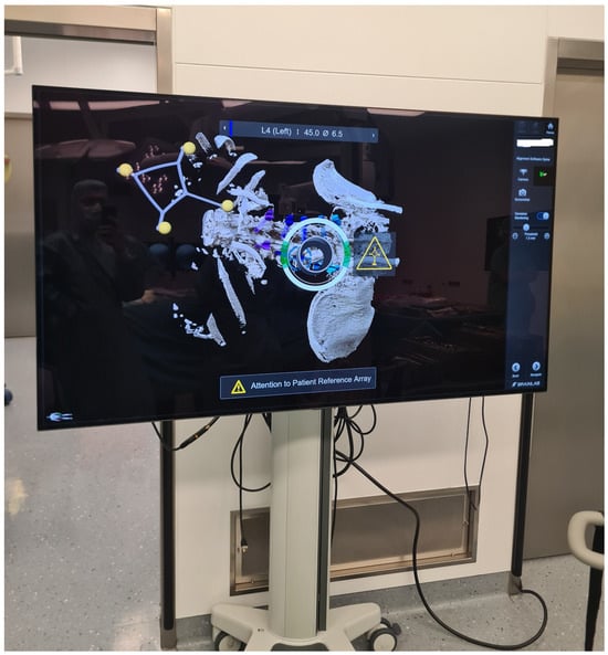 The time per screw has been reported differently in the literature: 3 min [], 4 min [], or even 7 min []. Urakov reported a time per screw of 3.6 min for the midline approach and 5.7 for the percutaneous approach []. Differences in robotic and operating time depend on many factors, such as installation time, software problems during the surgery, surgical steps in addition to PS implantation, and the navigation platform. A meta-analysis of 16.040 PSs showed that the Medtronic (Minneapolis, MN, USA), Stryker (Kalamazoo, MI, USA), and BrainLab platforms had similar accuracy, but the surgical time was significantly shorter with Brainlab, and the risk of pedicle breach was lower with all platforms compared to conventional techniques []. One of the recognized advantages of RG spinal surgery is the reduction in radiation exposure. In a review of 38 studies by Caelers et al. [], the use of C-arm resulted in a higher effective dose for surgeons, a higher absorbed dose for patients, and higher exposure compared to C-arm- and O-arm-based navigation and the RG technique. A systematic review of intraoperative radiation involving 85 studies showed that navigation based on intraoperative imaging has the lowest radiation exposure for the surgeon, although there is a relative increase in radiation exposure for the patient compared to the FG technique []. Like other studies, the Cirq® system reduced staff radiation, but intraoperative challenges (e.g., reference array positioning, skiving in osteoporotic bone) mirrored known RG limitations [,].