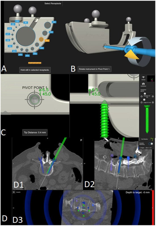 Figure 16. Steps for calibrating the screw, positioning the screw in (A) a receptacle of the calibration matrix according to the screw diameter and at (B) a pivot point of the matrix with (C) final adjustment of screw length and verification of calibration accuracy, with the screw at the pivot point of the matrix. (D) Representation of screw implantation in the navigation matrix with preplanned screws (blue) and actual screws (green) in (D1) axial, (D2) sagittal, and (D3) target/perpendicular view.