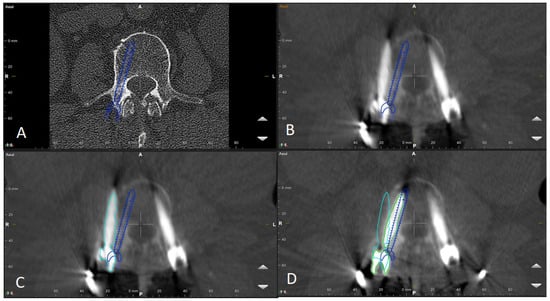 Figure 17. (A) Surgical site following stabilization. (B) Registration iCT with preplanned trajectories. (C) Fusion of registration and control iCT. (D) Control iCT with superimposition of preplanned trajectories and actual screws.