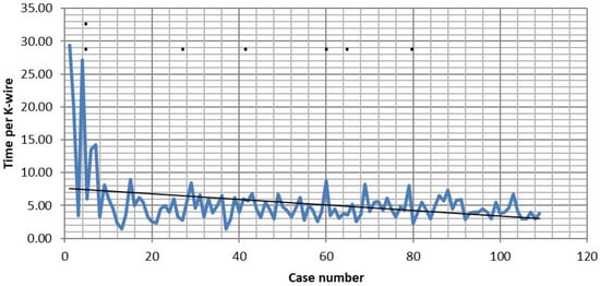 Reduction in time per K-wire during the observation period. Points (•) indicate cases with intraoperative screw revision.