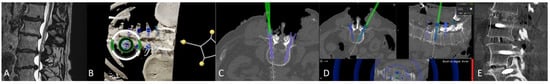 (A) Preoperative T2-weighted MRI of the lumbar spine shows spinal canal stenosis and instability. (B) Intraoperative screenshot after positioning the kinematic unit of the robotic arm over the preplanned trajectory. (C) Position of the instrument holder at the entry point. (D) Intraoperative screenshot during screw implantation. All screws were GRS A. (E) Sagittal postoperative CT with screws and cages.