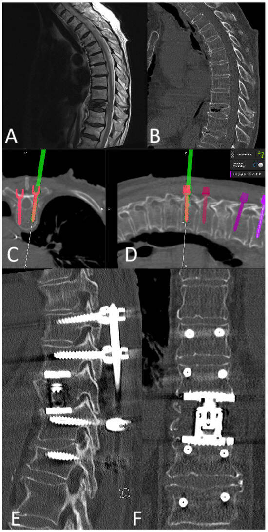 Preoperative (A) T2-weighted MRI and (B) CT of the thoracic spine, showing a pathological fracture of Th10 with instability. The patient underwent RG placement of K-wires followed by navigated placement of PS, shown here in intraoperative (C) axial and (D) sagittal view. In addition, an expandable vertebral body cage was implanted via a left transthoracic approach. Postoperative CT in (E) sagittal and (F) coronal view.
