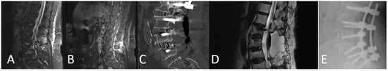Preoperative sagittal MRI: (A) T2-weighted and (B) T1 post-contrast MRI shows an empyema with spondylodiscitis and a fracture of the L4 vertebra. The patient underwent RG PS placement at L2-S1, followed by cage implantation. Nine screws were GRS A, and one screw was GRS C. Postoperative sagittal lumbar spine (C) CT, (D) T2-weighted MRI, and (E) X-ray.
