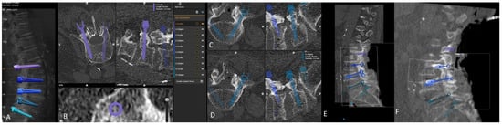 Preoperative planning of PS for stabilization of L2-S1 according to preoperative CT in (A) sagittal view after automatic detection of vertebrae and (B) planning of the position, length, and diameter of each screw in axial, sagittal, and perpendicular view. (C) Axial and sagittal view of the right L5 screw with automatic planning—note that the screw tip is aligned towards the endplate. (D) Position of L5 screw right after manual repositioning. (E) Fusion of preoperative CT and iCT registration scan. (F) Fusion of the registration and control iCT scan.