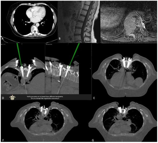 (A) The preoperative CT scan six months before surgery shows an osteolytic lesion in the right Th9 pedicle. A CT-guided biopsy was performed in another department, confirming the tumor, whereupon radiation therapy was initiated. Due to progressive pain with spinal ataxia, an MRI scan of the spine was performed. The preoperative T1 post-contrast (B), sagittal, and (C) axial MRI results show tumor growth from the right pedicle with vertebral body collapse and compression of the dural sac. The patient underwent RG PS placement. The reference array was placed on the spinous process of Th7 and a total of 8 PSs were implanted. (D) Accuracy check with a pointer in the iCT scan to check the PS position. (E). Th8 GRS A PS. (F). iCT shows malposition of the Th7 screw on the left side, a GRS E screw, without any injury to vessels, pleura, or lungs. After removal of the screw, a new RG PS was inserted. (G) The correct position, shown in a repeated control iCT scan.