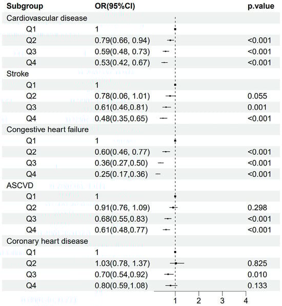 In addition, regarding the interaction between sex and HRR, there may be the following reasons: firstly, sex hormones play an important role in cardiovascular disease. Estrogens have a cardiovascular protective effect and reduce the risk of atherosclerosis, whereas androgens may increase the risk of CVD []. Secondly, women typically have a weaker inflammatory response and higher antioxidant capacity compared to those in men, which may reduce damage to the cardiovascular system from oxidative stress [].