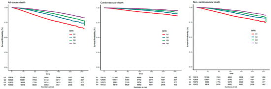 The Kaplan–Meier curves show the cumulative survival probabilities for all-cause death, cardiovascular death, and non-cardiovascular death in quartiles of HRR levels. Abbreviations: Q1: quartile 1; Q2: quartile 2; Q3: quartile 3; Q4: quartile 4; HRR, hemoglobin-to-red cell distribution width ratio.