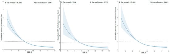 Restricted cubic spline curve for the relationship between HRR and risk of all-cause death, cardiovascular death, and non-cardiovascular death. Abbreviations: HRR: hemoglobin-to-red cell distribution width ratio.