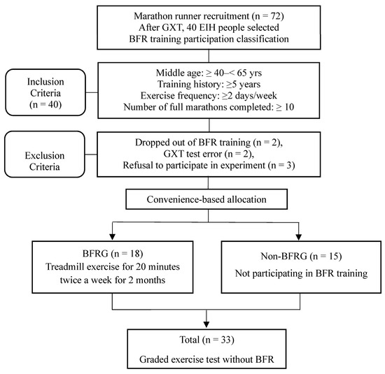 The study procedure is presented in Figure 1. Participants were defined as middle-aged males between 40 and 65 years old, with at least five years of exercise history, at least 10 completed marathons, and a minimum exercise frequency of twice per week. Out of the 40 EIH runners initially enrolled, two participants dropped out during the BFR training period, two were excluded due to measurement errors caused by mechanical malfunctions, and three declined to participate in the final experiment. As a result, a total of 33 participants were included in the final analysis (BFRG: 18; non-BFRG: 15). The participants were divided into two groups by convenience-based allocation. Statistical analyses were conducted to compare pre- and post-exercise differences between the two groups. This study was approved by the Institutional Review Board of Korea National Sport University, following the guidelines of the 1975 Declaration of Helsinki (IRB number: 20230921-091).