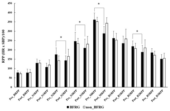 Changes in RPP in GXT before and after BFR training. RRPP: rest rate pressure product; S: stage; MRPP: maximum rate pressure product; R: recovery; BFRG: blood flow restriction group; *: significant difference between pre- and post-exercise at p < 0.05.