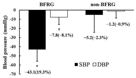 Changes in maximal blood pressure in response to BFR training. BFRG: blood flow restriction group; SBP: systolic blood pressure; DBP: diastolic blood pressure. * Significant difference in SBP between BFRG and non-BFRG (p < 0.05); †: Significant difference in DBP between BFRG and non-BFRG (p < 0.05).