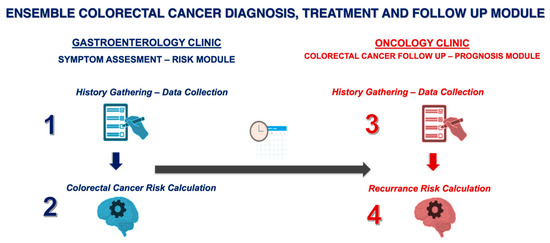 Outline of the Ensemble Colorectal Cancer Diagnosis, Treatment and Follow-up Module. Gastroenterology Clinic—Symptom Assessment and Risk Module a. History Gathering—Data Collection (Step 1) b. Colorectal Cancer Risk Calculation (Step 2). Oncology Clinic—Colorectal Cancer Follow-up and Prognosis Module a. History Gathering—Data Collection (Step 3) b. Recurrence Risk Calculation (Step 4).