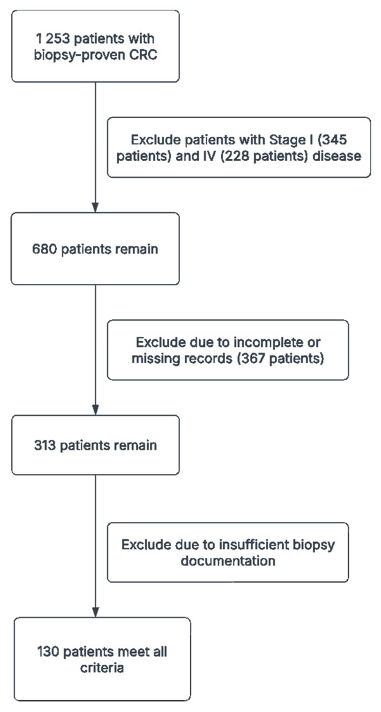 The initial dataset consisted of 1253 patients with biopsy-proven CRC. After applying the inclusion and exclusion criteria, a total of 130 patient cases were included in the final dataset. The collected data were preprocessed to ensure data quality and consistency, including data cleaning, normalization, and encoding.