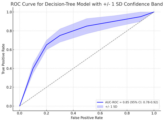 ROC curve showing the performance of the decision-tree model in predicting the need for colonoscopy, with an AUC-ROC of 0.85 (95% CI: 0.78–0.92).].