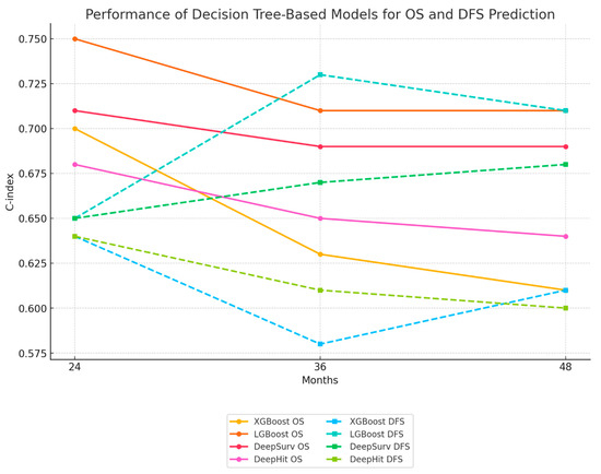 Line graph showing the performance (C-index) of different decision tree-based models (XGBoost, LGBoost, DeepSurv, DeepHit) for overall survival (OS) and disease-free survival (DFS) prediction at 24, 36, and 48 months. (p-values: XGBoost = 0.04, LGBoost = 0.03, DeepSurv = 0.05, DeepHit = 0.07).