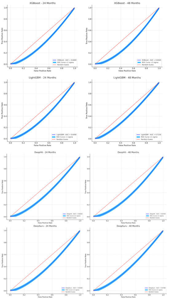 Illustrates the predictive accuracy of different models (XGBoost, LightGBM, DeepHit, and DeepSurv) at 24 and 48 months, with the ±1 sigma range highlighted to emphasize the variability and confidence in the ROC curve estimates.