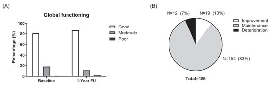 The overall distribution of global functioning severity in the cohort remained largely consistent between baseline and 1-year follow-up (Figure 1). The proportion of patients with good, moderate, or poor global function by ASAS HI score (as good (ASAS HI ≤ 5), moderate (ASAS HI > 5 and <12), or poor (ASAS HI ≥ 12)) was 151 (81%), 33 (18%), and 1 (1%) at baseline, and 161 (87%), 21 (11%), and 3 (2%) at 1-year follow-up, respectively (Figure 1A). Upon individual assessment of change, nineteen patients (10%) showed improved global functioning (decrease ≥ 3) at 1-year follow-up. Global functioning deteriorated in 12 patients (7%) (increase ≥ 3) and was maintained in 154 patients (83%) (Figure 1B).