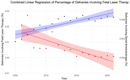 Development of fetal laser therapy and serial amniondrainage as a percentage of de-liveries in Germany between 2005 and 2021: The plot shows the linear regression line with the 95% confidence interval shaded around it. The left y-axis represents the percentage of deliveries involving fetal laser therapy surgeries (FLT, blue line), and the right y-axis represents the percentage of deliveries involving serial amniondrainage (SAD, red line). The linear regression line, along with the 95% confidence interval shaded around it, illustrates the statistical significance of the increasing use of FLT and the decreasing trend in SAD.