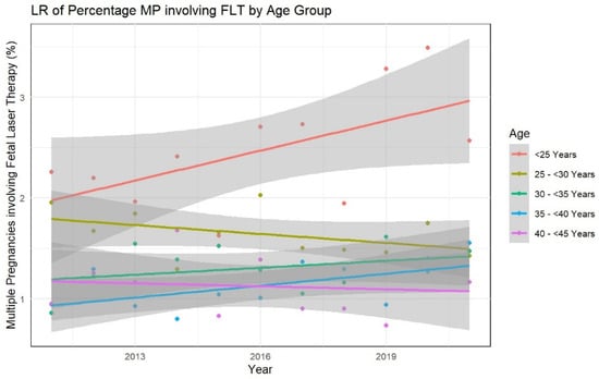 Percentages of multiple pregnancies involving fetal laser therapy surgery by maternal age groups over time: The plot includes the regression lines with 95% confidence intervals for each age group. The x-axis represents the years, and the y-axis represents the percentage of multiple pregnancies involving fetal laser therapy surgery between 2011 and 2021. Each color corresponds to a different age group. The regression lines and 95% confidence intervals for each age group are plotted to show the trend in the use of FLT across different maternal age categories. LR: likelihood ratio, MP: multiple pregnancies, and FLT: fetal laser therapy.