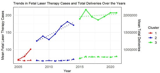 Clusters of development in fetal laser therapy in Germany from 2005 to 2021: Scatter plot visualizing the clustering of fetal laser therapy (FLT) surgeries across three distinct periods (Clusters 1, 2, and 3), with each cluster representing a different phase in the development of FLT in Germany. The solid lines represent FLT surgery cases, while the dashed lines show total deliveries (scaled down by 10,000). The points on the plot represent the mean values, and the triangles highlight the center of each cluster. Cluster 1: years 2005–2007; cluster 2: years 2008–2014; cluster 3: years 2015–2021, solid lines: fetal laser therapy surgery cases, dashed lines: total deliveries (scaled down by 10,000), points: mean values, triangles: mean values, and dotted lines: trend lines.