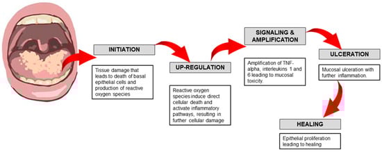 Initiation of Tissue Injury: Radiation and chemotherapy induce cellular damage, leading to the death of basal epithelial cells. The production of reactive oxygen species (free radicals) by these treatments is also thought to contribute to the onset of mucosal injury [7,11].