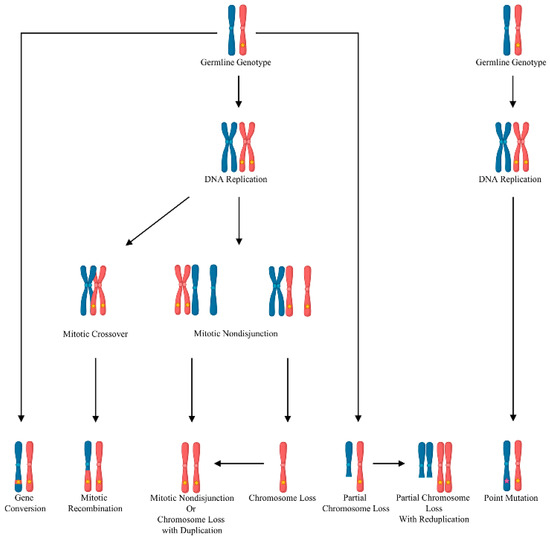 Mechanisms of somatic gene inactivation. Mechanisms of somatic loss of heterozygosity resulting in loss of wild-type allele (blue) and homozygosity or hemizygosity for germline mutation (yellow star). Genetic analysis would show only chromosome of germline mutation (red) over region of loss of heterozygosity, which may be relatively small (Gene Conversion) or extend from point of mitotic recombination to end of chromosome (Mitotic Recombination) or lead to loss of whole chromosome (Chromosome Loss with Duplication). Somatic point mutation of wild-type allele (purple star) may also result in biallelic gene inactivation. In this case, germline and somatic mutations are distinct, and somatically mutant cells retain their constitutional zygosity at all loci. Created in BioRender (2025).