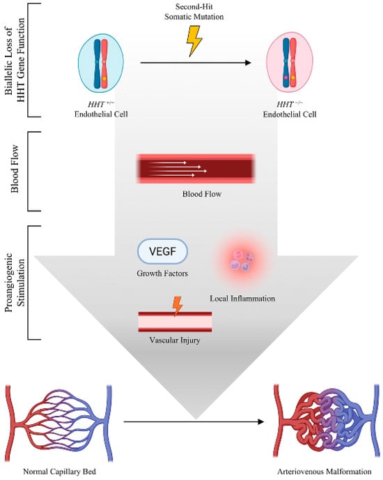 Multifactorial model of HHT-associated AVM development. Proposed model of HHT-associated vascular malformation pathogenesis in which biallelically mutant endothelial cells respond to hemodynamic cues and angiogenic stimulus inappropriately to develop arteriovenous malformation. Germline mutation (yellow star). Somatic inactivation of wild-type allele (purple star). Created in BioRender (2025).