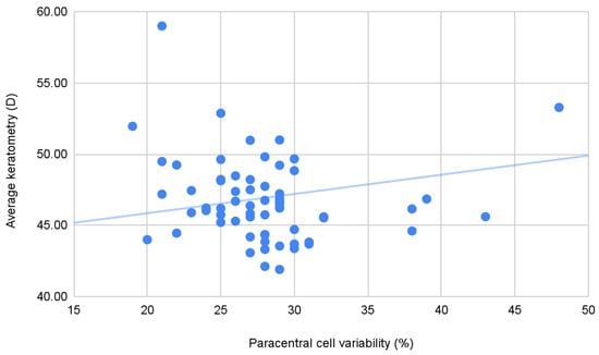 Correlations between average keratometry and paracentral cell variability in the entire study cohort before crosslinking.