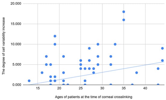By correlating the degree of change in several variables to the baseline values, we can understand how crosslinking influences both biomechanical and endothelial data. The degree of change in several endothelial parameters depended on the baseline biomechanical and topographical characteristics of the cornea—see Table 13. Firstly, there was a weak–moderate positive correlation between age and cell variability increase after CXL—the older the patient, the greater the variability increase in the endothelial layer—see Figure 3.