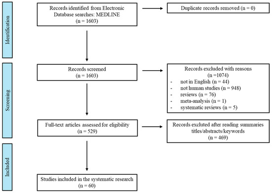 Following the removal of duplicates, a total of 1603 studies were identified, with 529 available as full-text articles. A review of the literature on genotoxic exposure to carcinogenic agents and occupations showed that occupational exposure was the most frequently researched factor (n = 60) (Figure 2). Much research has been conducted on painters (n = 23), the rubber manufacturing industry (n = 14), and aluminum production (n = 8). Several studies have been conducted on X- and gamma-radiation (n = 7), cyclophosphamide (n = 4), and benzidine (n = 3). However, few studies have focused on human genetics and S. haematobium infection (n = 1) or 4-aminobiphenyl and 2-naphthylamine (n = 1). No research has been directly related to auramine production, chlornaphazine, firefighters, magenta production, opium consumption, and ortho-toluidine.