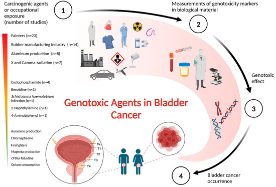 Through the integration of existing scientific findings, we developed an in-depth summary highlighting the patterns and relevance of genotoxic effects, drawing on data from studies examining various exposures associated with bladder cancer. Specific examples are provided for the genotoxic alterations caused by 16 individual agents (e.g., aluminum production; 4-aminobiphenyl, 2-naphthylamine, ortho-toluidine, benzidine, auramine, and magenta production; firefighting; painting; rubber manufacturing; chlornaphazine; cyclophosphamide; opium consumption; X-radiation; gamma-radiation; S. haematobium infection).