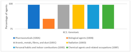 A significant role has been attributed to the increasing use of molecular and genetic markers in research on the key characteristics of human carcinogens. Epidemiological studies conducted in vivo in humans, such as in professional environments, often analyze biomarkers reflecting DNA damage; that is, the formation of DNA adducts, clastogenic effects, and gene mutations. This makes these studies the main source of genotoxicity data. One study showed that the most prevalent mechanistic characteristic of 86 group 1 agents was genotoxic (KC2). The occurrence of genotoxicity as one of the KCs was observed in most of the 86 agents (Figure 3). Among the mechanistic characteristics, genotoxicity was the most common, identified in 85 of 86 agents. This study also showed that among the KCs for KC2, the most common source of information was human in vivo studies. Studies have been conducted in humans for the following agent types: 100A—pharmaceuticals (n = 20); 100B—biological agents (n = 10); 100C—arsenic, metals, fibers, and dust (n = 10); 100E personal habits and indoor combustions (n = 8); 100F—chemical agents and related occupations (n = 33); 100D—radiation agents (n = 5) [9].