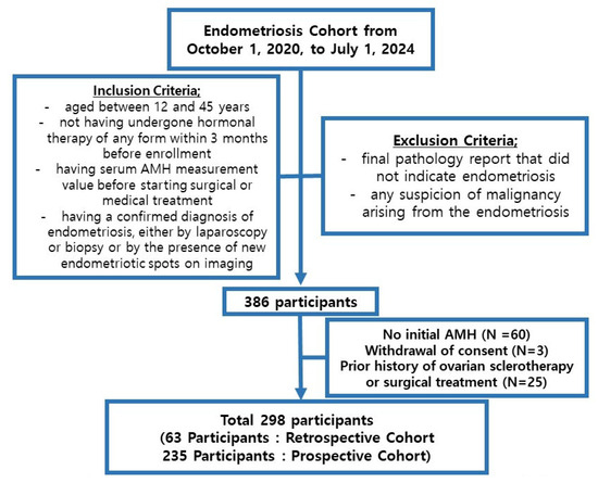 A total of 298 participants were enrolled in the endometriosis cohort at Severance Hospital in Seoul, Korea, from 1 October 2020 to 1 July 2024. This study combined prospective and retrospective cohort studies. A total of 63 participants diagnosed with endometriosis before 15 October 2020 were included in the retrospective cohort, while 235 participants diagnosed after 15 October 2020 were included in the prospective cohort.