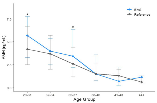 Age-specific comparison of AMH levels between EMS and reference groups using median and interquartile range (IQR). Vertical error bars represent the 25th and 75th percentiles. Asterisks (*) indicate statistically significant differences in the median based on bootstrap 95% confidence intervals.