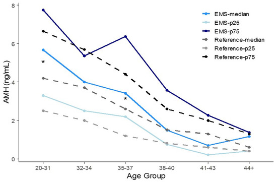 AMH percentiles (25th, median, 75th) plotted by age group for EMS and reference populations. Each percentile is shown as an independent line. Asterisks (*) mark significant differences in median values identified by bootstrap analysis.