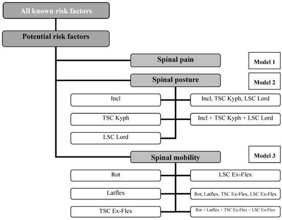 These are the questions being investigated in this study, so, the Bonferroni-corrected local level of significance must be set, in this case, at α = 0.05/3 = 0.017. Statistical analysis was performed using linear regression. In order to organize the data collected, we developed three regression models. They combined scientifically acknowledged risk factors with the potential spinal-related risk factors additionally considered in our study (model 1: back pain; models 2.1–2.5: spinal curvature; models 3.1–3.6: spinal mobility) (see Figure 1). In order to deal effectively with the multi-causality of the issue of falling, the data of the three potential risk factors—back pain, spinal curvature, and spinal mobility—were adjusted in the statistical analysis to the scientifically acknowledged risk factors. All data were analyzed using the Statistical Package for the Social Sciences (SPSS), (IBM, Armonk, NY, USA) Version 20.0 software.