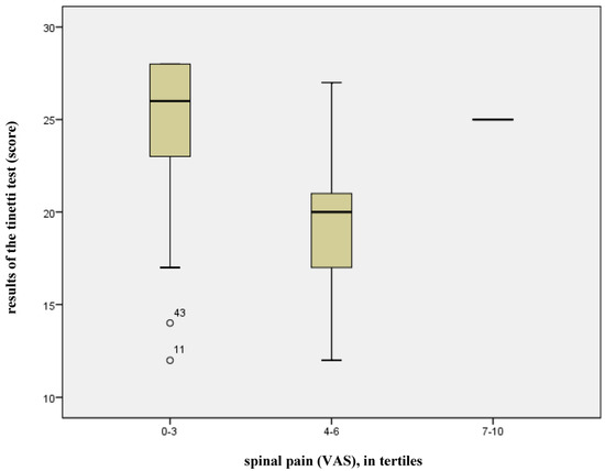 Back pain had a statistically significant influence (p = 0.010) on the risk of falling for patients with osteoporosis. The gradient of the respective regression line (−1.552) illustrates the clinical relevance of this factor, implying that an increase on the pain scale by one point reduces the score of the Tinetti test by 1.5 points. A total of 68% of the variance in falling risk can be attributed to model 1, i.e., to already scientifically acknowledged risk factors + back pain (adjusted R2 = 0.678, see Figure 1). The remaining 32% can be attributed to other factors which were not taken into account in this model. The box-plot diagram (see Figure 2) shows the relationship between back pain and the results of the Tinetti test, illustrating the effect of a low level or absence of back pain (VAS 0–3, n = 85) on the Tinetti test. Point scores of more than 20 indicate good balance and secure gait, while scores of 20 or less indicate a risk of falling. In the diagram, the scores for back pain, as expressed on the VAS, were divided into tertiles. The high point score of 7 yielded by the Tinetti test on the VAS can be considered an exception, as it relates to one single subject only.