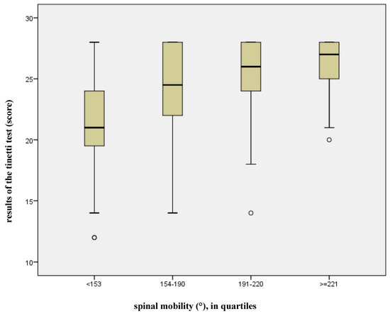 Spinal mobility, expressed as the sum score of all independent motion amplitudes of the spine (rotation, lateral flexion, sagittal flexion/extension) showed a statistically significant influence on the risk of falling (p = 0.013). Furthermore, the examination of the linear regression line revealed that 64% of the variance in the risk of falling can be attributed to model 3 (previously scientifically acknowledged risk factors and spinal mobility, adjusted R2 = 0.640, see Figure 1). The remaining 36% can be attributed to other factors which were not taken into account in this model. Figure 3 shows a box-plot diagram of the relationship between overall mobility and the risk of falling. For this purpose, the total spinal mobility was divided into quartiles, with each assigned to the Tinetti test point score. It is evident that balance ability and security of gait increase in the Tinetti test point score (maximal value 28, cut-off-value ≤ 20 points) in proportion to the mobility of the spinal column.